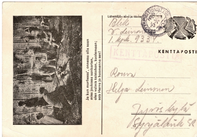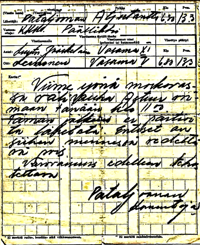 Yllä olevassa kuvassa näkyy Pekka Leinosen isän 13.3.1940 vastaanottama radioviesti, joka kuuluu näin: