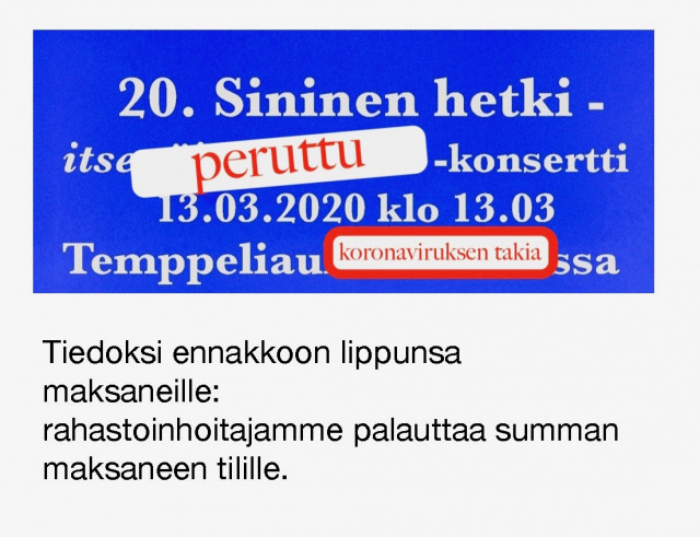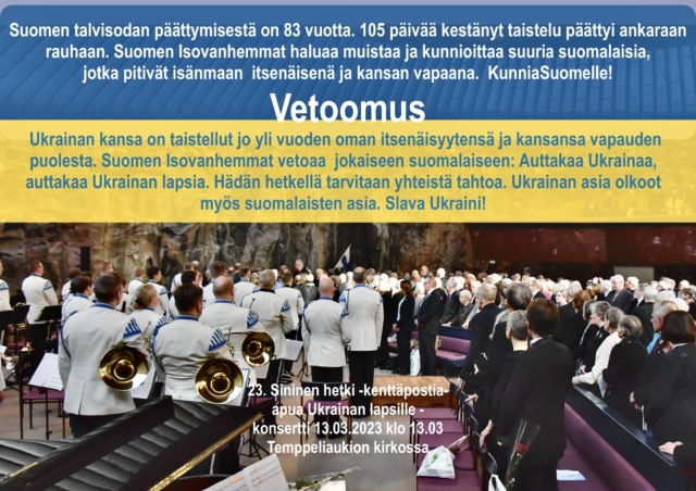 Vuoden 2023  23. Sininen hetki – kenttäpostia -konsertti 13.03. klo 13.03 Temppeliaukion kirkossa, jälkihaaste: APUA Ukrainan lapsille KP-kortilla.